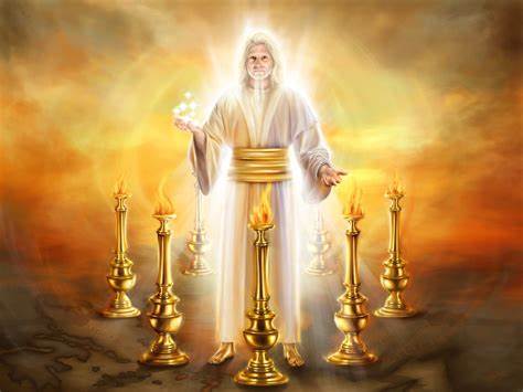 Revelation 1:12 CSB “12 Then I turned to see whose voice it was that spoke to me. When I turned I saw seven golden lampstands, 13 and among the lampstands was one like the Son of Man, dressed in a robe and with a golden sash wrapped around his chest. 14 The hair of his head was white as wool—white as snow—and his eyes like a fiery flame. 15 His feet were like fine bronze as it is fired in a furnace, and his voice like the sound of cascading waters. 16 He had seven stars in his right hand; a sharp double-edged sword came from his mouth, and his face was shining like the sun at full strength.